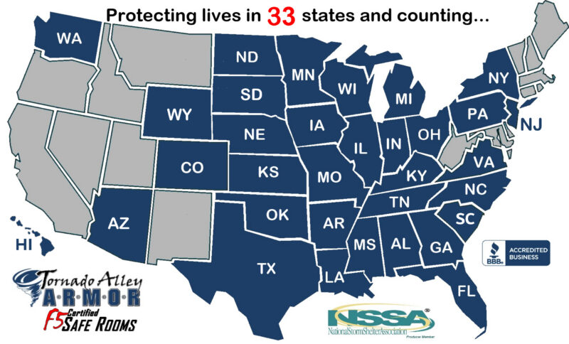 Protecting Lives in 33 States across the USA. Nationwide delivery and installation of Tornado Alley Armor EF-5 rated tornado safe rooms. Currently protecting lives in 33 states. EF-5 rated tornado storm shelters that also provide intruder panic room features as well as walk in property vaults. Visit our home page or call 918-518-1551 7 days a week for assistance over the phone.